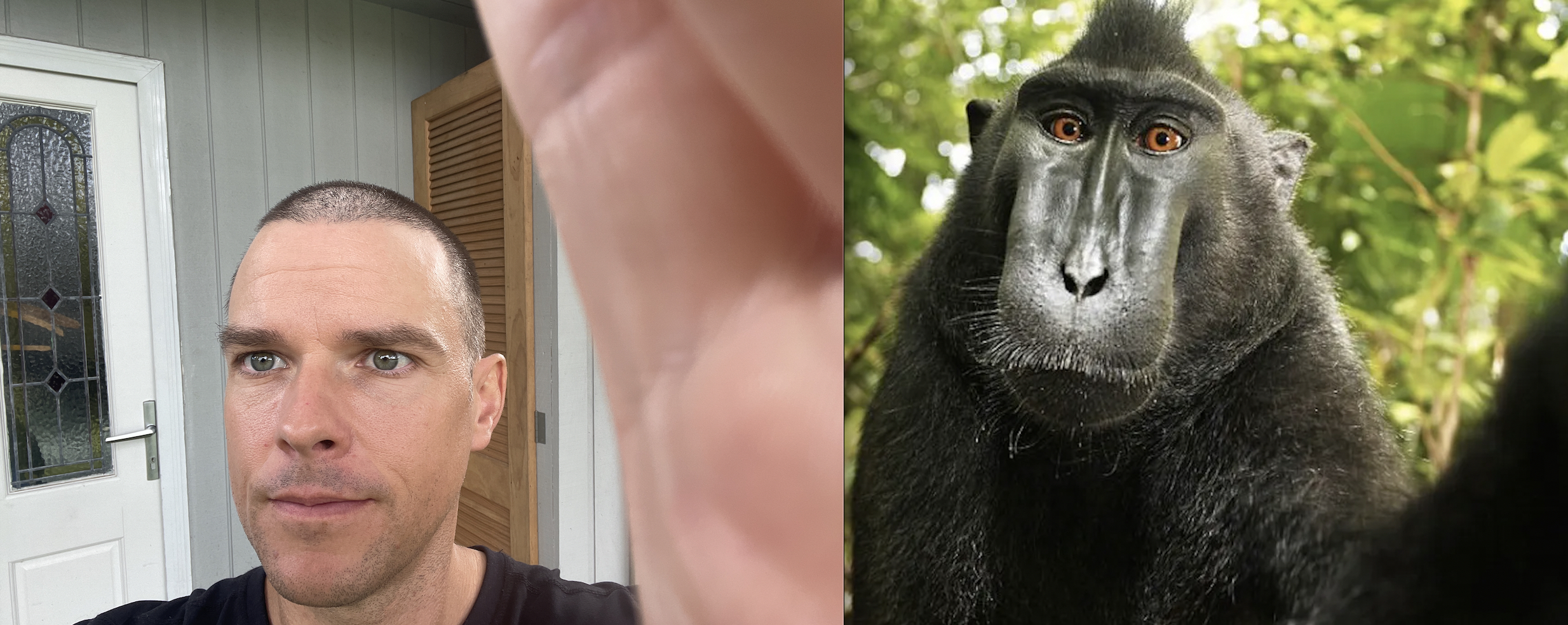Photo on left is of/by Mattanaw©™, the author. Photo on right is by Naruto, using a camera owned by David Slater. Believed to be photoshopped. Both are Primates.