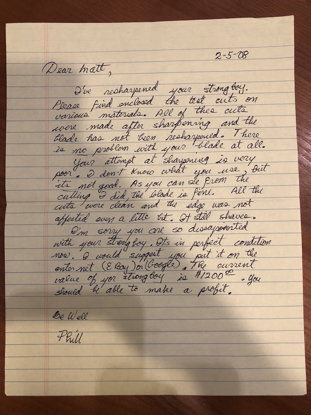 His response to my letter indicates he thought I was disappointed with the knife. However, I was very happy with it, but wanted some guidance to be able to sharpen it myself. In retrospect, I see it would have taken significant training to do that. Most knives have false edges, creating room for sharpening errors. Sharpening imperfections do not affect the overall appearance of cheap blades, since only the steel nearest to the cutting edge is grinded away. The rest of the bevel goes untouched. This knife, however, does not have a false edge, so it must be skillfully sharpened to create the same perfect slope, from the top of the slope, all the way to the cutting edge. Any blemish is quickly noticed, so it is best done by Phill or someone well trained.