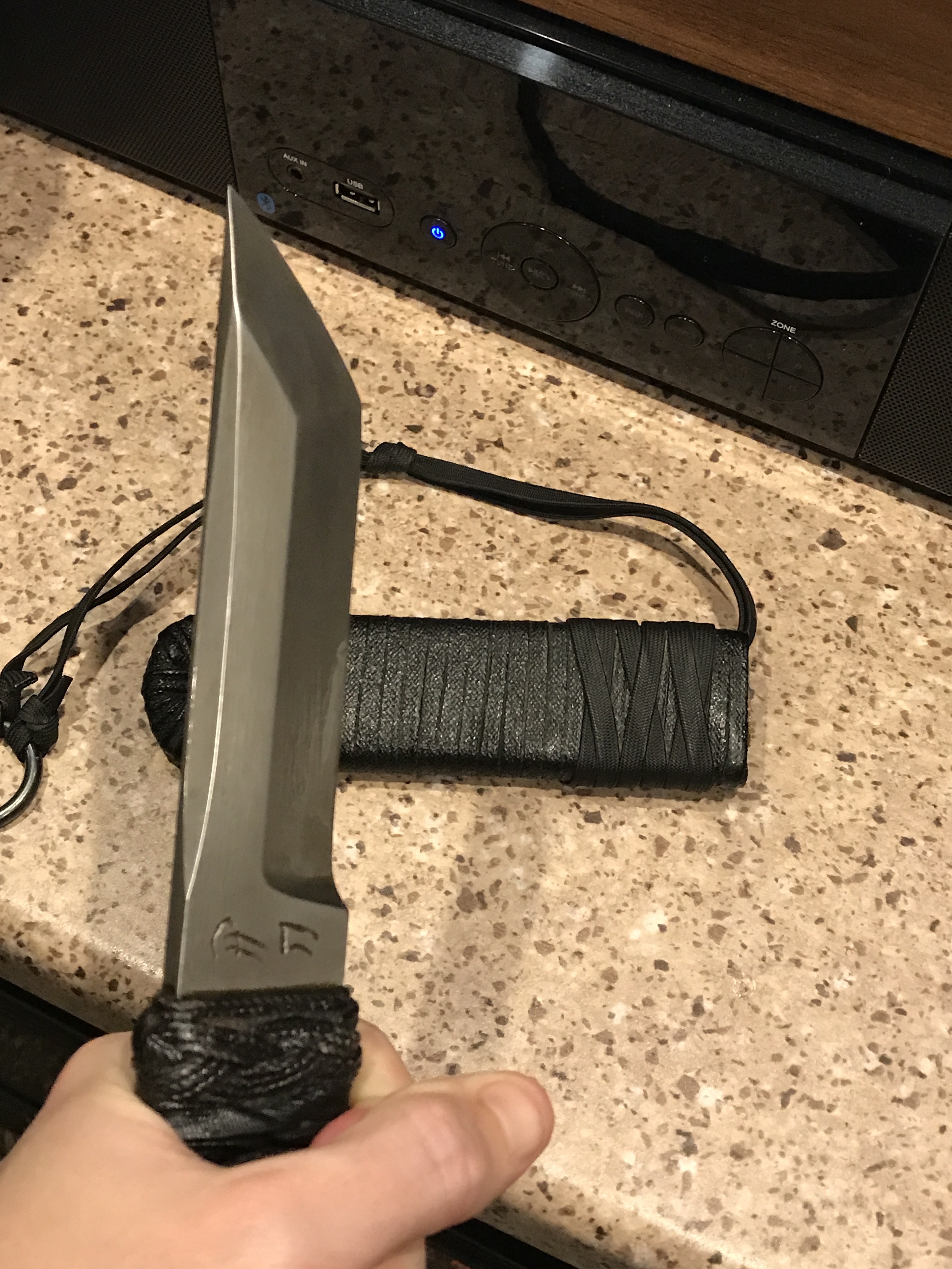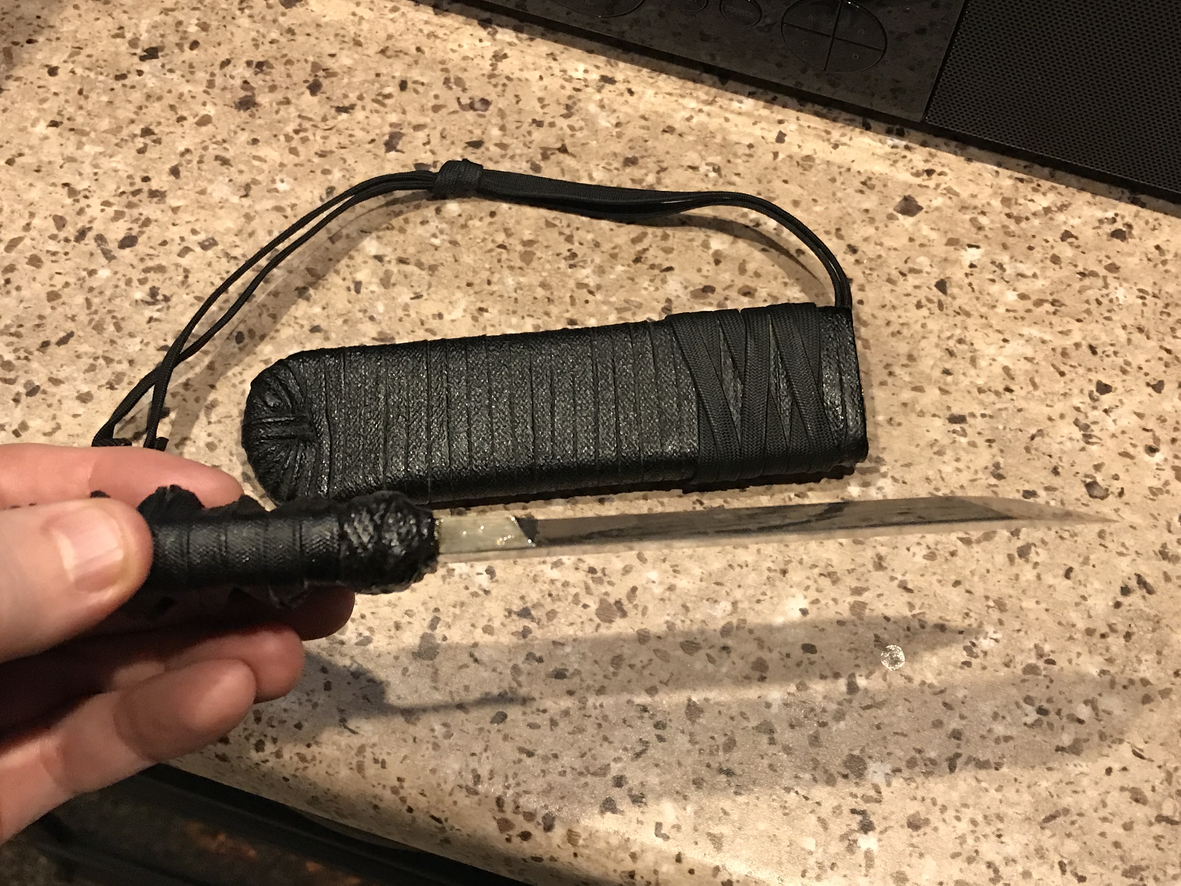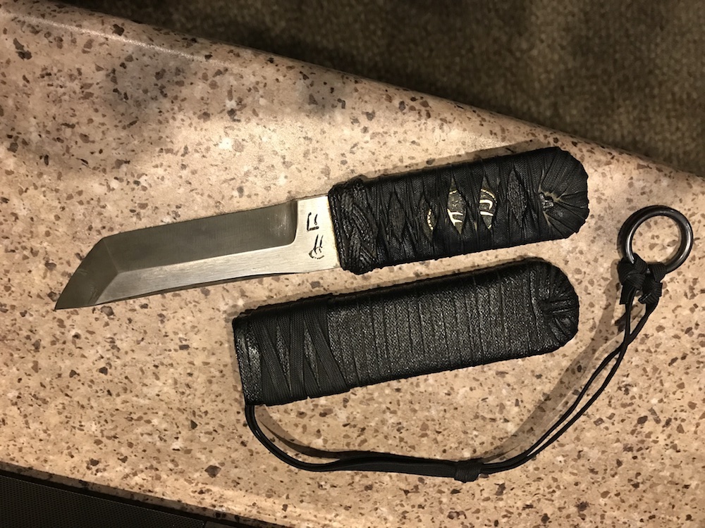 The knife I purchased is a Custom Strongboy, which is a heavier variant of his popular Kwaiken. A Strongboy is basically the tip of a sword (Phill also made swords), with the samurai wrapped handle. My knife has the following features: